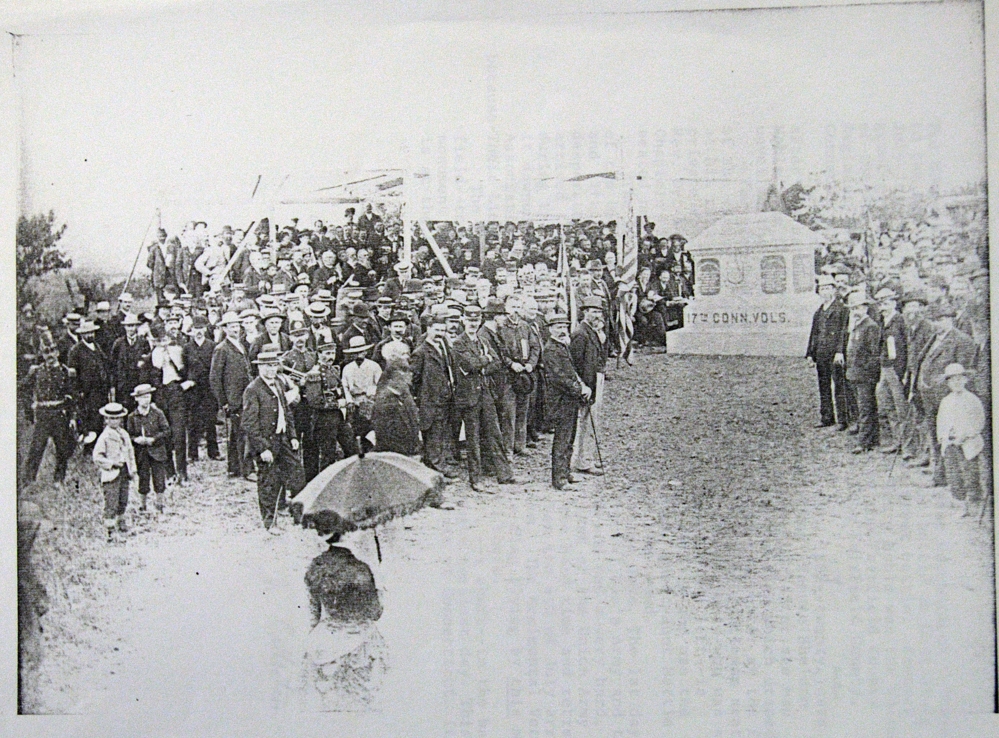 From inscription on reverse of original photograph: The picture represents the scene just after [Fannie Sheldon Noble] unveiled the Monument by drawing aside the flag which draped it. The grey haired gentleman seated in the center at the front of the canopy is [General William Henry] Noble. The gentleman seated at his right is Governor Lounsbury of Connecticut--who was a private soldier in the Regiment--the one at his left--is Rev. Dr. William K. Hall of Newburgh, New York who was the Chaplain of the Regiment.