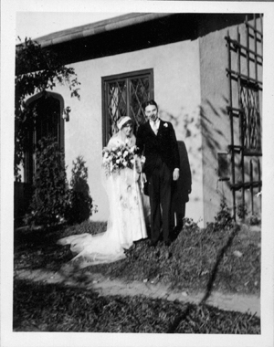Martha Josselyn DeVoe and Frank Kenneth DeVoe at wedding reception at bride's parents' home in Pleasantville, NY, 10 October, 1931. Photo taken by Edgar Josselyn.