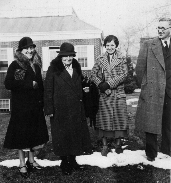 From inside back cover of DeVoe photo album.  Gladys (Troup) Stickler made the following identifications starting at left (interview 1 July 2003): Capitola Troup (?), Lillian Adams (?), Rachel Troup, Charles Troup (?).  Gladys thought the man at right looked like her father, although she didn't remember him wearing glasses.