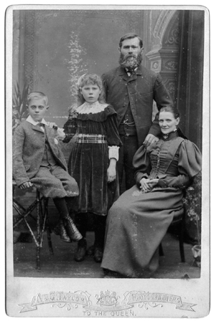 From left: James Robert (Bob) Kidd, Beatrice Kidd, Charles Kidd, Mary Jane (Jennie) Kidd. Photo provided by Margaret Troupe, May 2003. Borrowed from the estate of Toby Harrison.